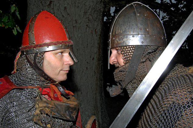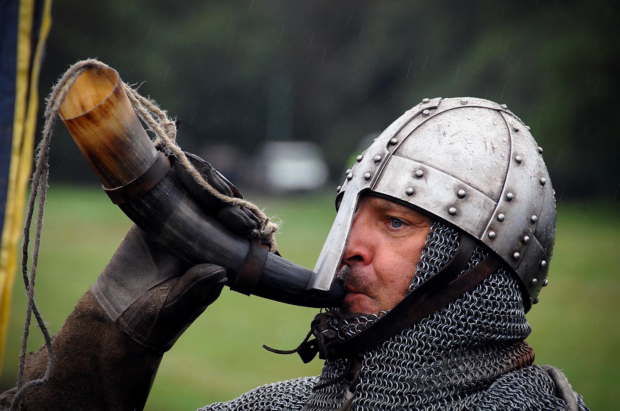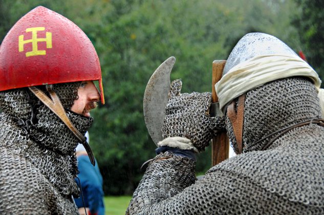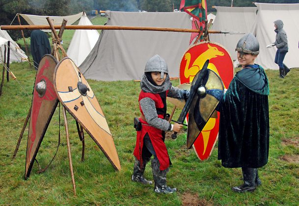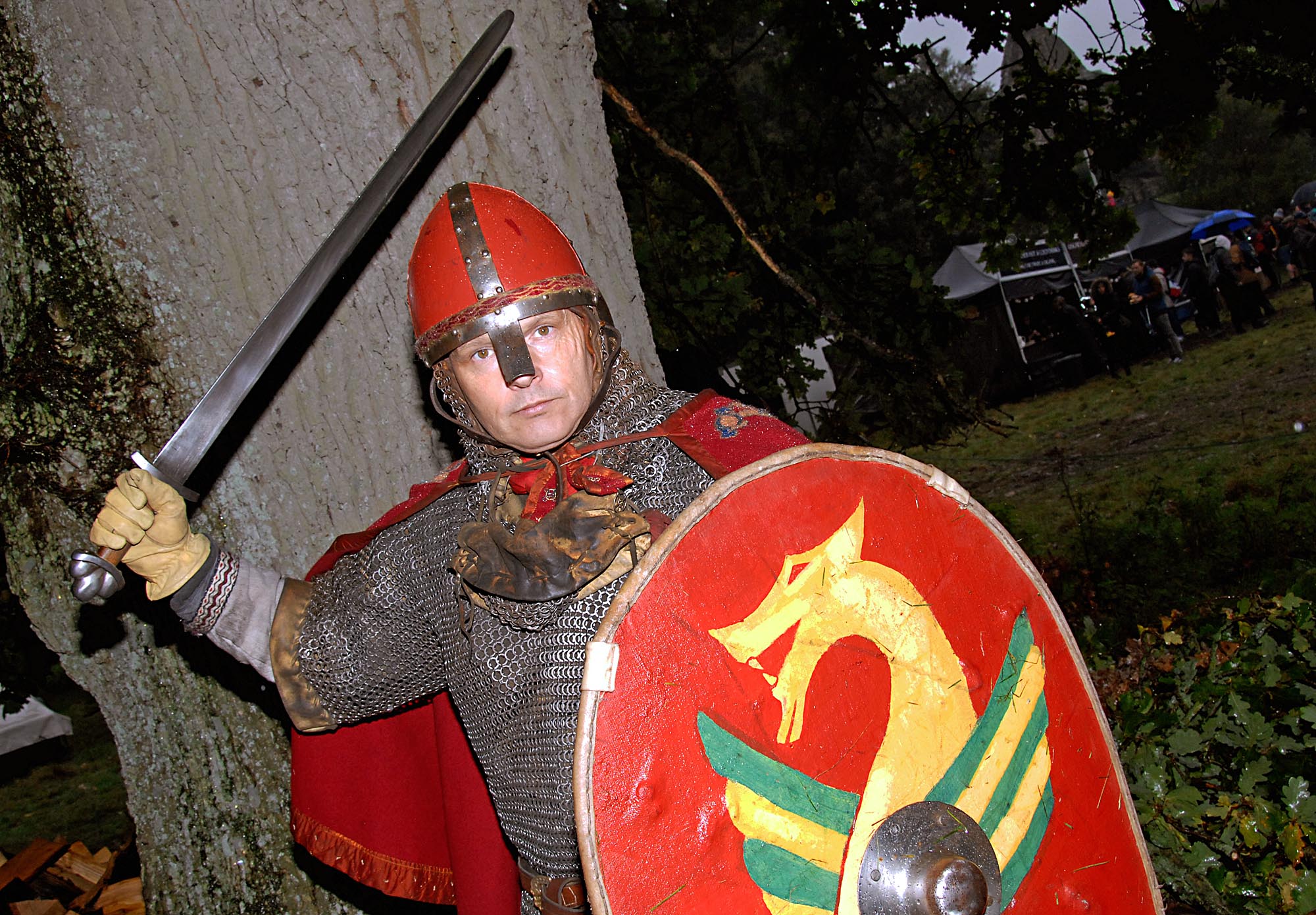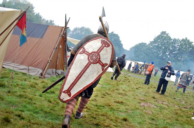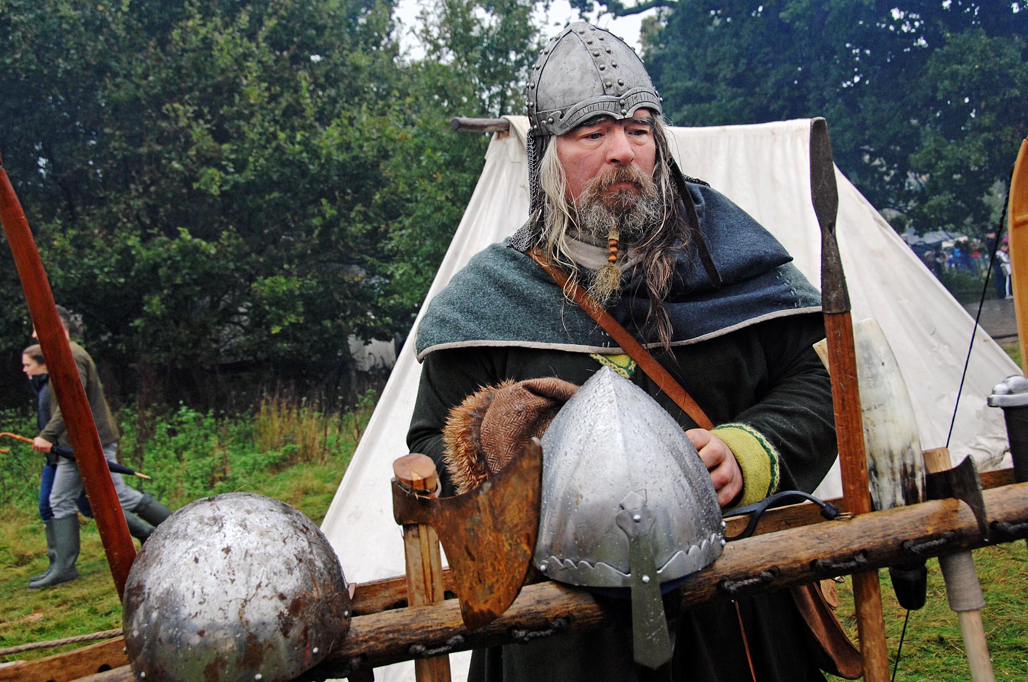 Ken Kinrade (right) has been portraying King Harold for more than eight years now. A science teacher when out of battledress, he hails from Staffordshire, “The heart of Mercia” he says. Ken is passionate about medieval history and the world of re-enactment – you’d have to be really, his outfit of chain mail, sword and leather accessories weighs over 80lbs: “It’s exhausting just wearing this kit all day, and that’s before fighting off the Normans.”