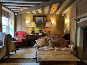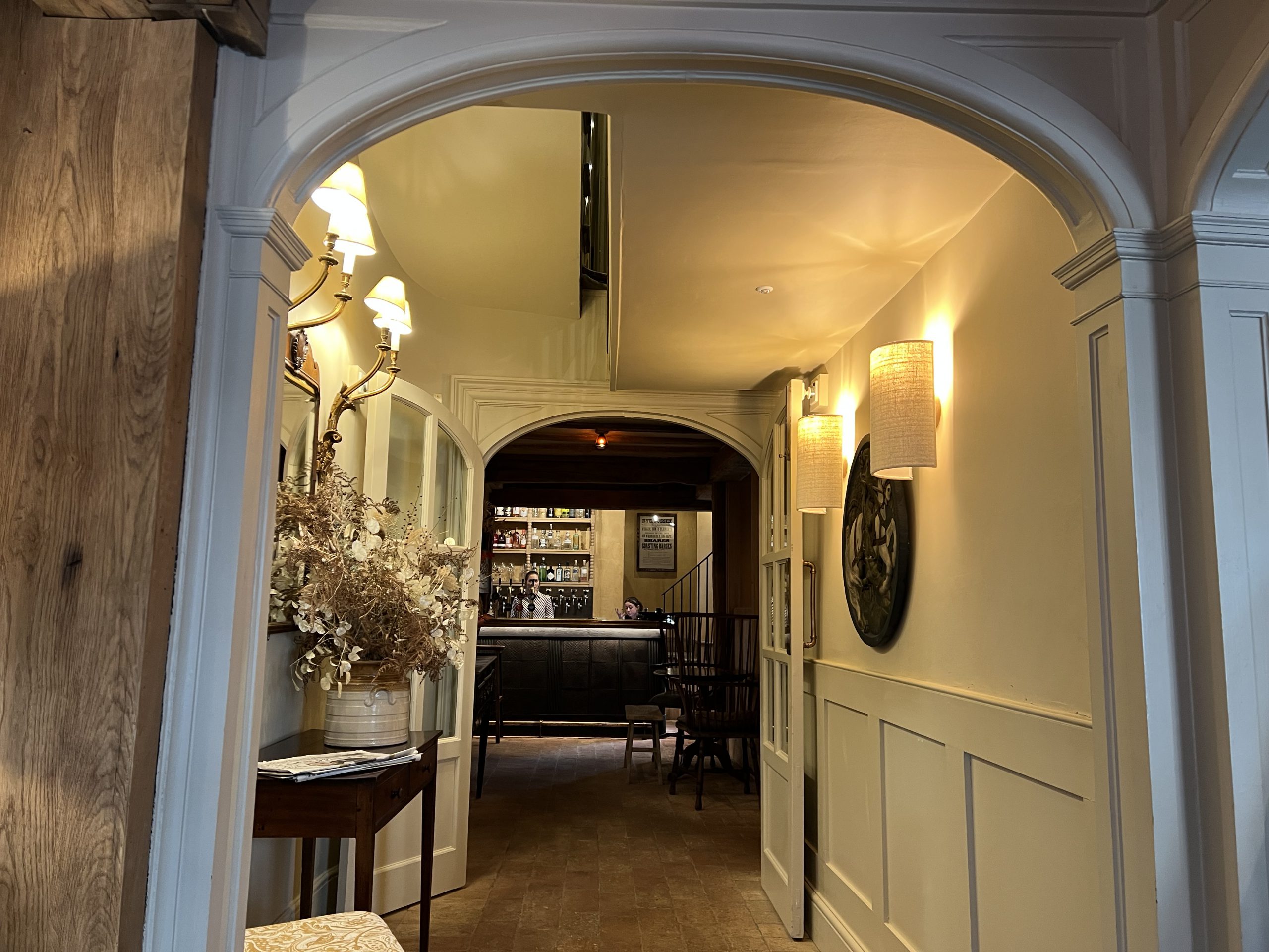 Six months since its opening, and it is time to go back to see what is happening. We chose it for a big Danish family birthday celebration. There is no doubt the interiors of the hotel are a triumph in most rooms. That cosy sofa area upon entering through the main door is lovely. Paintings and pottery from local artists accentuate the rich tapestry of colour. In May, the shop attached to the George before the fire had been re-configured into a confusing parlour room. Now, this area is being changed again, into a smaller, more practical cosy cocktail bar, with the re-installing of a shop out front.