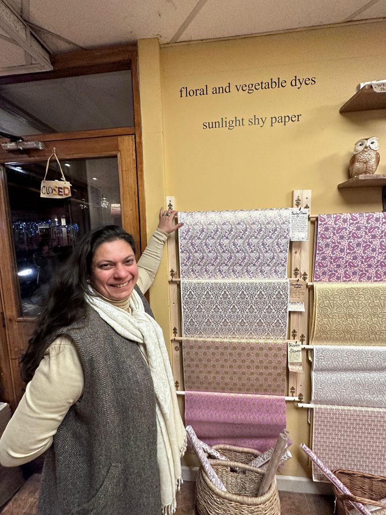 Step into this little gem called The Paper Place. Anwesha will greet you with her warm smile and extraordinary stories. She is the dream-developer for the beautiful paper, fabrics and many lovely gifts you will find. She asked me first to feel the sheets of paper festooning the walls. Each type of paper has a story, all of it recycled from materials such as wool, silk, and even the leftovers of ladies’ bras. All of it made by hand and screen-printed in small communities in India. (I so want to share their own history and stories, but that is for another time.)