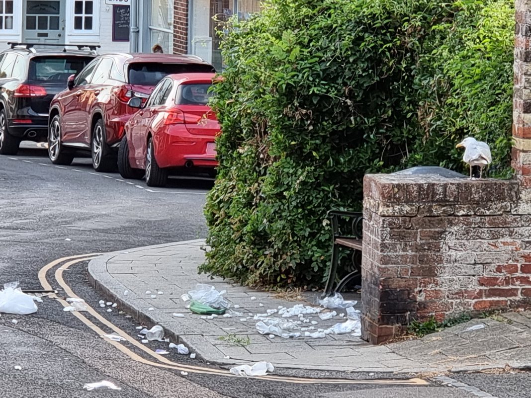 It’s seagull season again, and as usual at this time of year the horrible noise begins before dawn, the gull chicks mew pathetically on the rooftops (or in the street when they fall off, cannot fly and are abandoned) and the adults queue by the benches on the quay and in the churchyard, hoping to be fed the odd chip or snatch a pasty or ice cream. And, of course, they raid the black sacks and waste bins, leaving a swathe of debris strewn across the roads and pavements. Worse, as the chicks get older they pick up the bad habits of their parents.