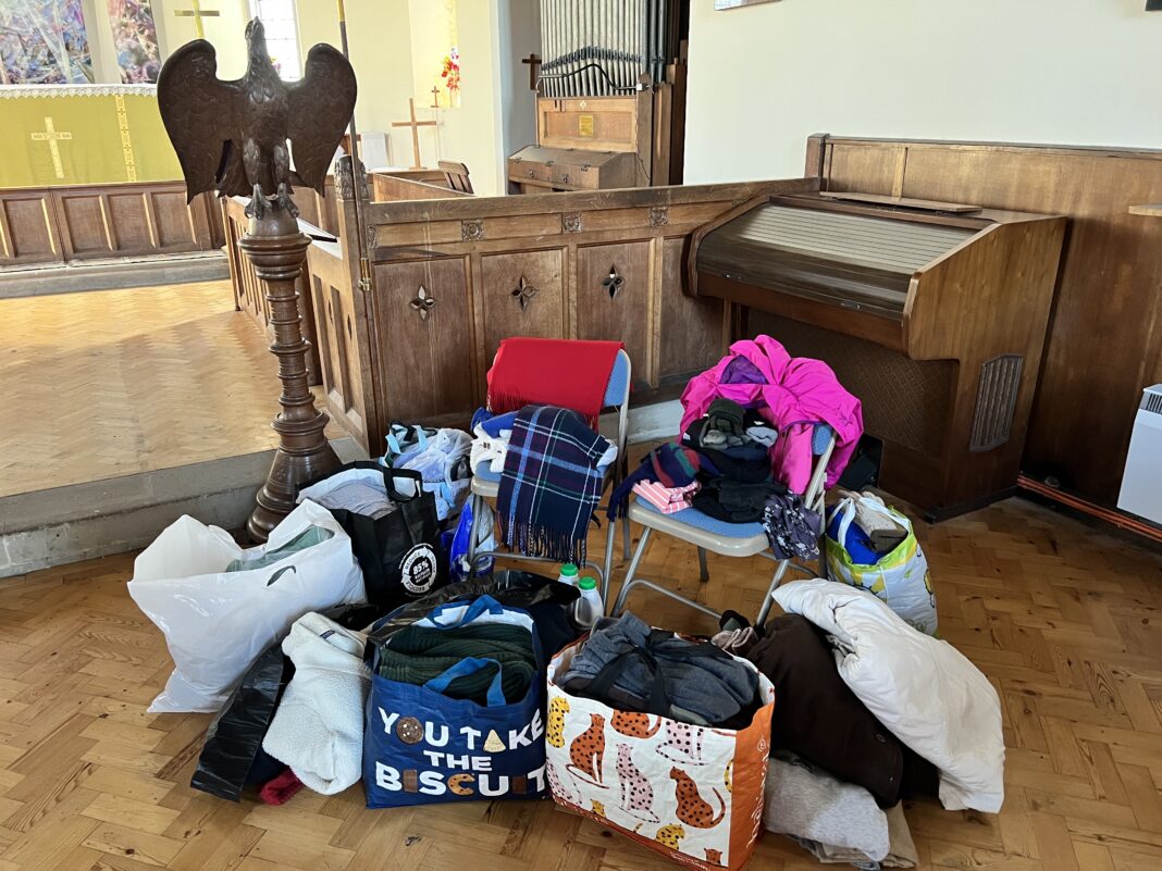 January has been so cold, wet, and miserable that it was decided to dedicate the service to warming up the homeless. The villagers and those in Rye were asked to donate warm clothing, especially waterproof coats, hats, scarves and gloves. Also requested was UHT milk and cans of food. The congregation did not disappoint. As people arrived, they dropped off their bags of donations and soon there was a wonderful display of things for the charity, Warming up the Homeless, in Bexhill. Their website informs us that their mission is “The relief of poverty among the street homeless / rough sleepers and homeless through the provision of items to support basic needs such as sleeping bags, ground sheets, survival sheets, blankets, clothing, food and toiletries. We also aim to improve the individual’s welfare through emotional support, even if it’s just a smile or by signposting them to other services. We endeavour to prevent harm to health by referring to emergency and similar services as and when necessary throughout Hastings, St Leonards, Eastbourne and Bexhill.”