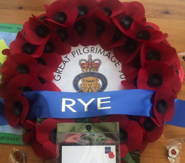 This year there have been numerous national and regional Remembrance commemorative events, including art installations; an effort to recruit 1400 bell ringers (number lost in the First World War) to support a countrywide peal of bells on 11 November; a commemoration of the “Hundred Days Offensive” at a special ceremony at Amiens Cathedral; a muster of 1100 standards of the Royal British Legion at Ypres. The Rye standard was amongst them to replicate the Great Pilgrimage of veterans to Ypres in 1928.