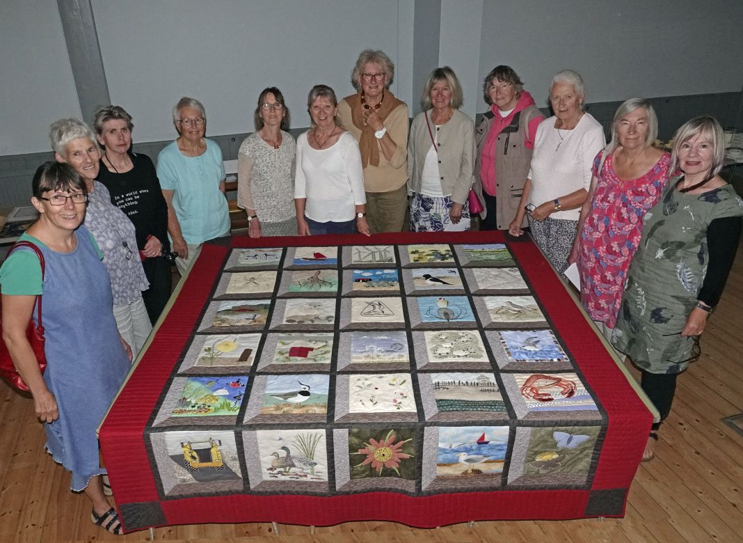 Twelve of the stitchers who contributed to the Rye Harbour Nature Reserve quilt came together in Rye Harbour village hall last week to see the completed work. This fabulous, hand-crafted quilt of 30 squares depicting wildlife and local landmarks of Rye Harbour, was created to celebrate 50 years of the Nature Reserve and to raise funds for the Discovery Centre.