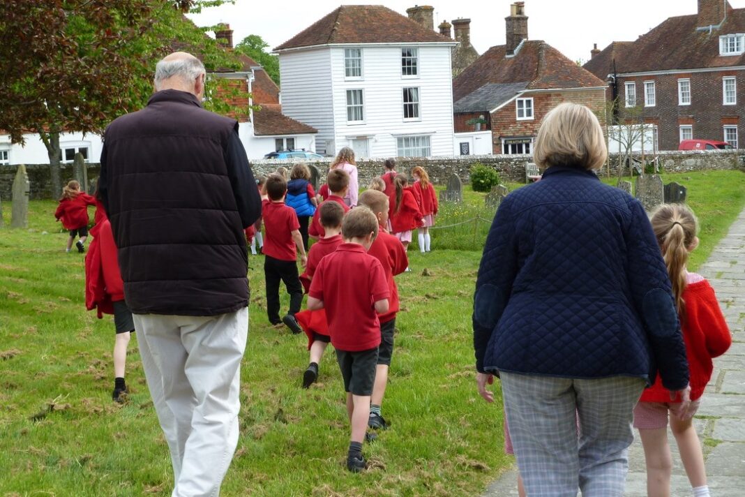A morning in the fresh air out of the school classroom? Of course, the children from the local primary school skipped into the Churchyard of St Thomas, Winchelsea, in a well-ordered crocodile to meet the vicar and learn about the three wildflower circles and the returning swifts and swallows.