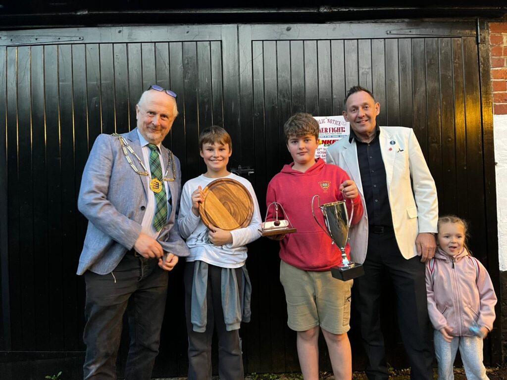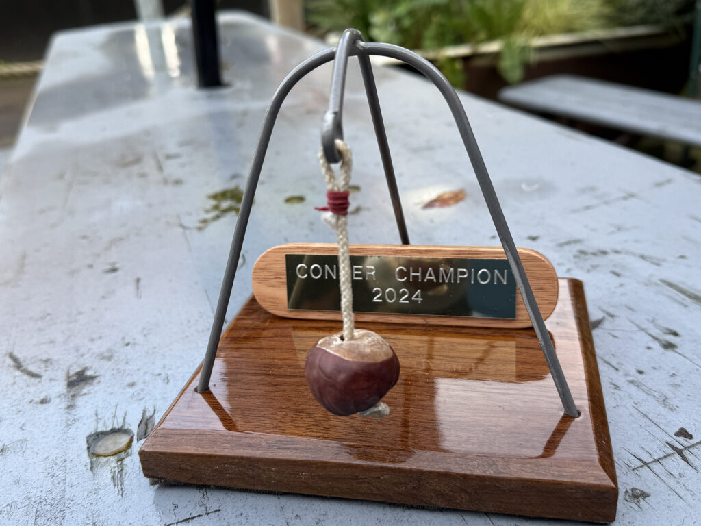 The awards were presented by Mayor Andy Stuart and event sponsor Andi Rivett of Rock Channel Marine. The adult award, won by Jake, included a silver cup and special trophy (including a swinging conker) designed and made by Andi Rivett, intended to be unique each year. The children’s award, won by Xavier, was a conker board engraved with the tournament name and winner. The children’s runner-up won a sweet box donated by Isabel Ryan.