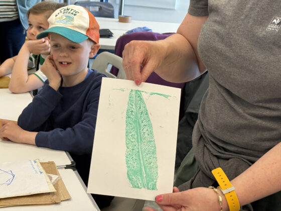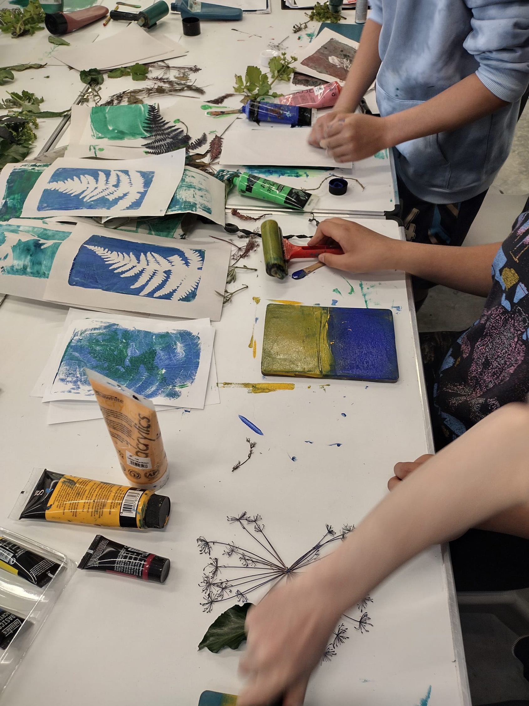 Aimi commented: “The children were very observant and made sketches and notes on the plants they found and were keen to discuss their findings. Back in the classroom we explored the shapes and structure of leaves through different monoprint experiments and the children created a fantastic range of colourful leaf prints.”