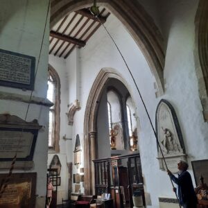 It’s far from digital and really quite erratic. Our clock gains about three minutes a week. It is reset every Friday by the verger Ben ‘Timelord’ Mason in time for the Sunday service starting at 10.30. If the clock strikes the half as rector Paul starts off, Ben glows with satisfaction. Not a simple thing though, because the clock is only 2 minutes fast on Friday and Ben has to allow for the clock to speed up at the weekend (like some of the clientele in here? Very droll!) How does he do it? Well as a fine horologist, he makes use of the “cobwebber”.