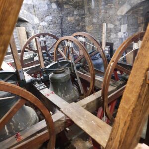 Yes, it had been whirring, turning and striking for maybe a couple of hundred years earlier but nobody knows where precisely, or what clever medieval engineer designed it and very likely fabricated it using blacksmithing skills of the finest order. If you are in the clock chamber on the hour you might be startled by a primitive propeller, mounted on the front, wheezing into life like a wingless flying machine. This is the flywheel driving the hammer for the tenor bell, one of the peal of eight, that strikes the hour from inside the tower while the quarters are brazenly struck by the gilded cherubs on the exterior.