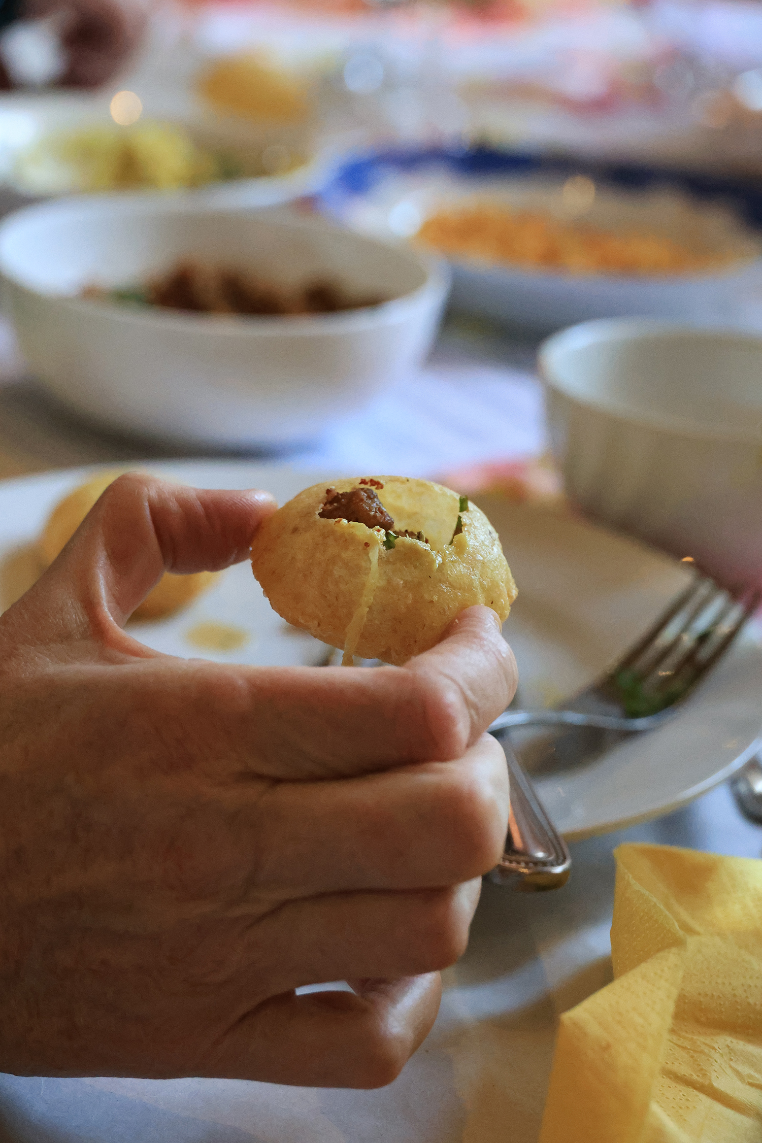 Hilary summed up the great evening and the preparations: “David, with telephone support from Kanta, taught a team of enthusiastic sous chef volunteers in the New Hall kitchen over two days to provide a memorable meal for the audience of over sixty. Winchelsea was introduced to many less familiar spices, herbs, tastes and textures. Cold and hot starters included chaat, Punjabi samosas and kochuri brought fresh from the top Sikh and Hindu suppliers in north and west London. Attendees had a lesson on how to prepare the popular Mumbai street food pani puri with homemade potato filling, roasted spicy chickpeas and tangy tamarind water.
