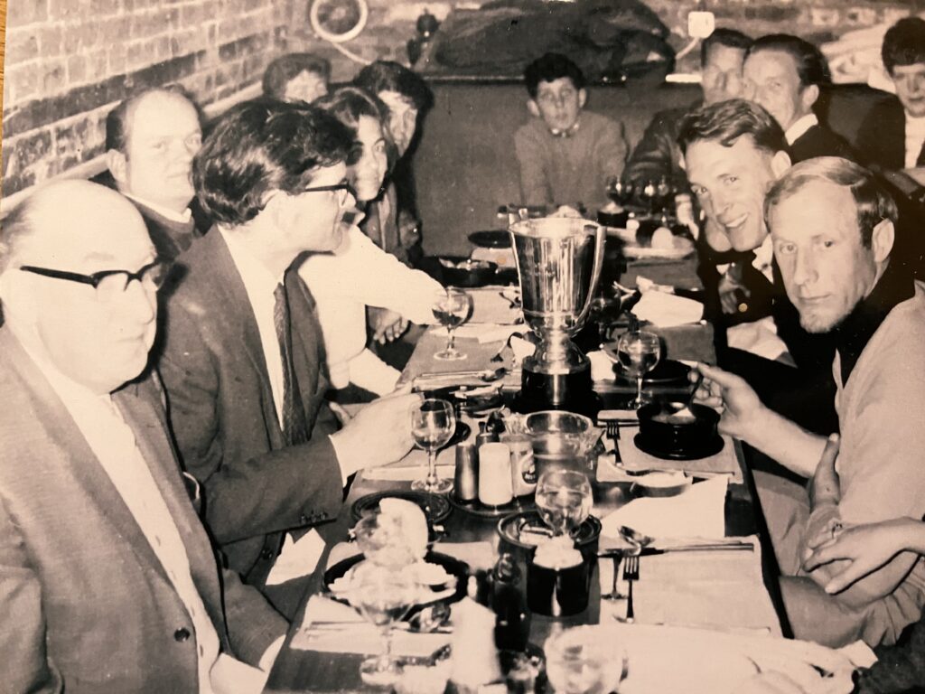 The Formula One Weslake Eagle team at The Forge restaurant in 1967 with Harry Weslake and Dan Gurney