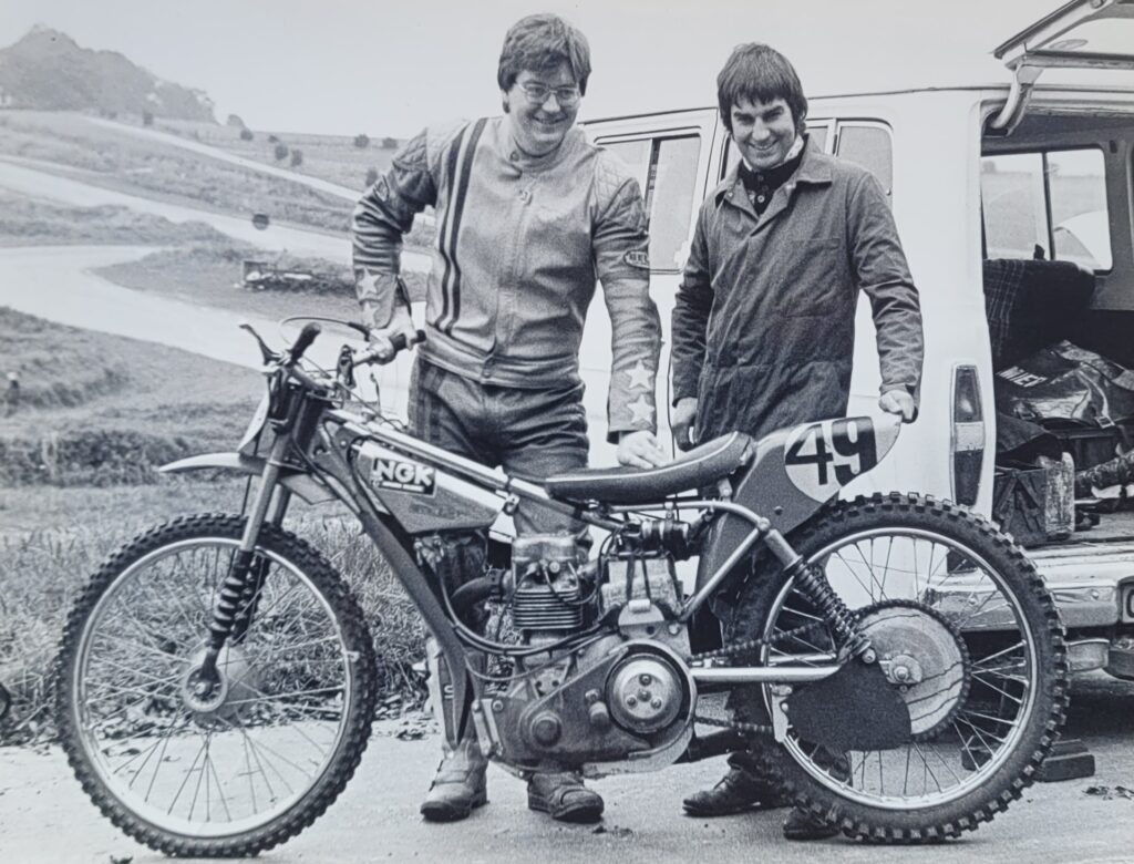 Mike Camier with Rex Bourne,, mechanic with Weslake Speedway bike, in Ocotber 1982 at Lydon near Dover