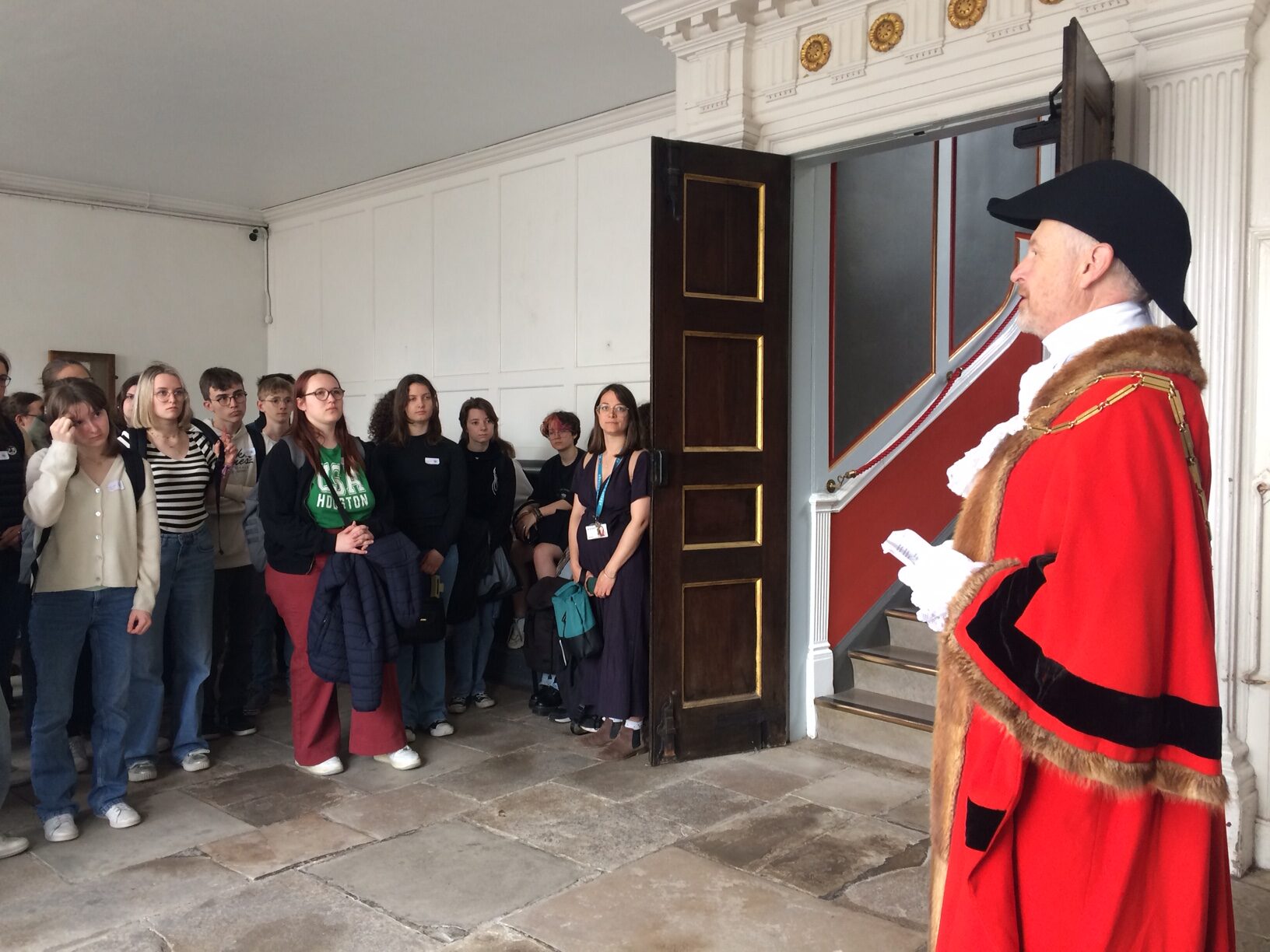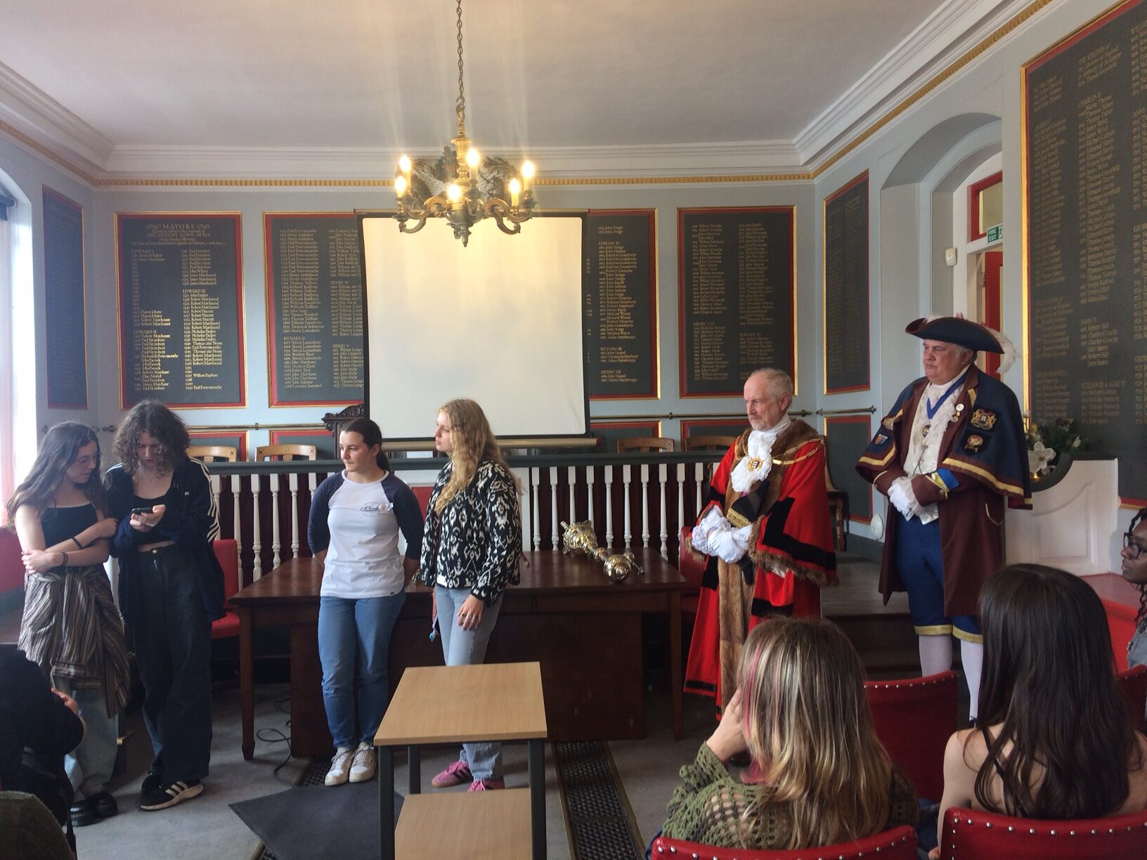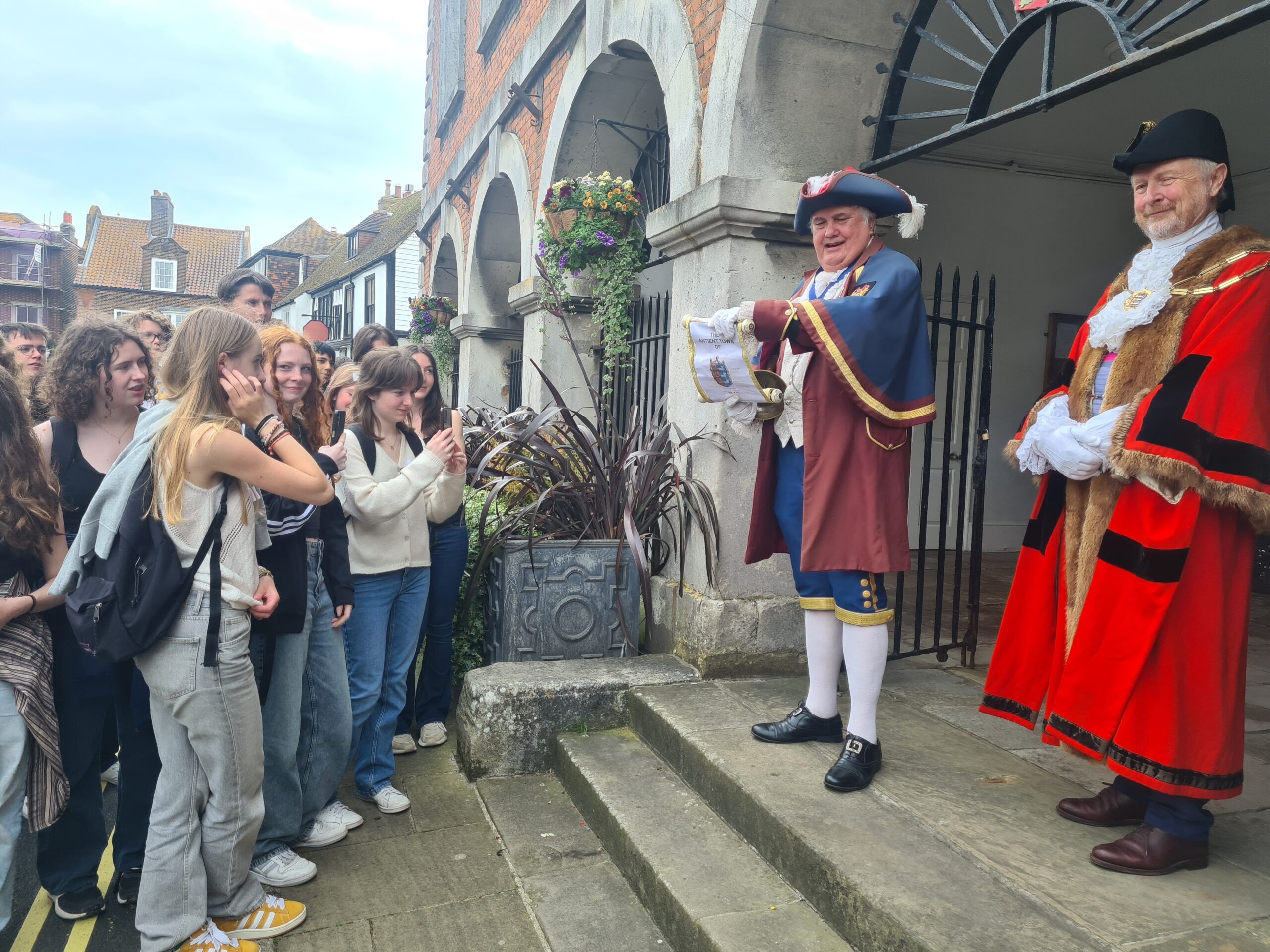 They then moved on to the town hall, where last year Mayor Pierre Ducrocq and two of his fellow councillors presented the then Rye Mayor Andi Rivett with a small lock to symbolise the friendship established between the two towns. Current Mayor Andy Stuart gave a welcome speech in French, which impressed all the students, before handing every student a small bell as a gift to remind them of the visit. A special cry was given by the town crier, possibly unlike anything the students had seen or heard before, followed by a short talk in the chamber about Rye from him.