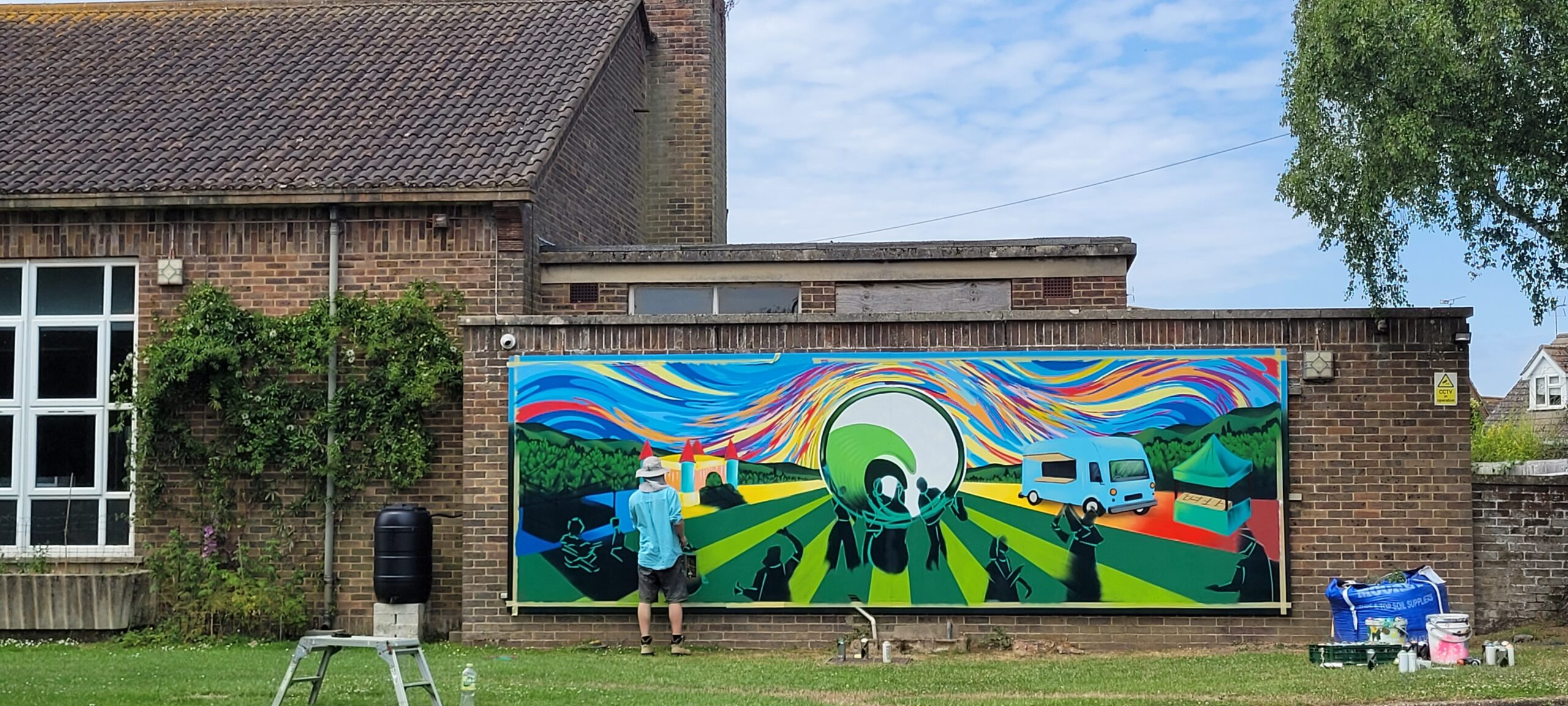 Fifteen years ago Luke Brabants painted a small mural that brightened up the hall at Tilling Green Community Centre adding colour and vibrancy to an otherwise dull room. He went on to create art on vehicles, walls, and canvases in many different shapes and sizes that can now be appreciated around Hastings, throughout Rother District and across the UK.  Last week he completed a 24ft by 8ft work covering the old cafeteria wall of the Community Centre facing Mason Road.