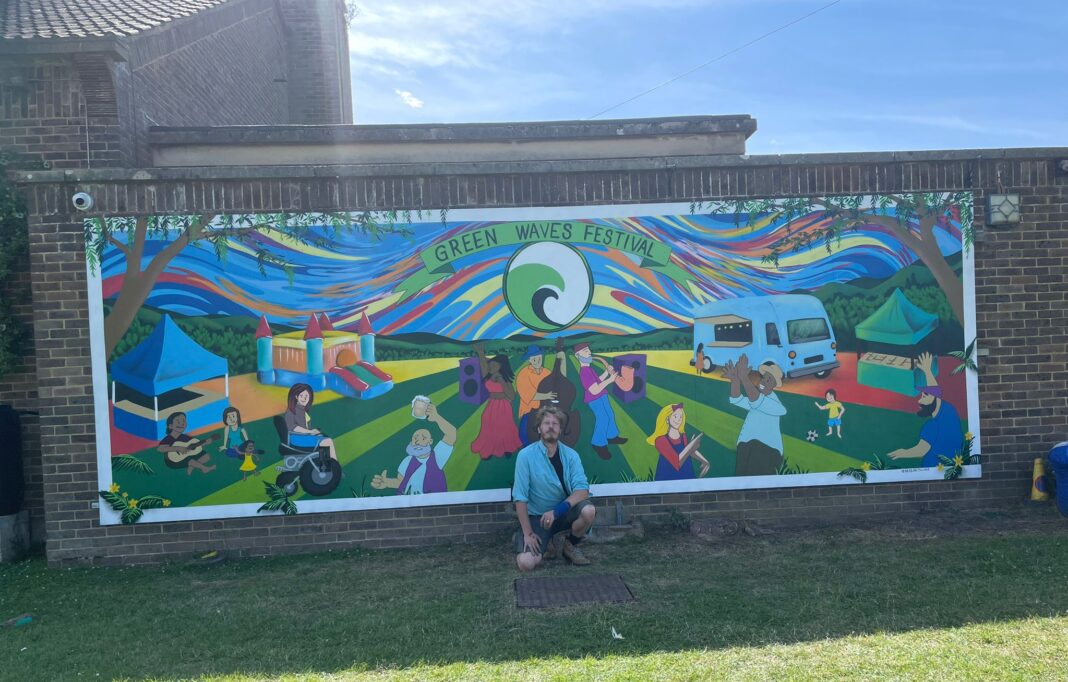 Luke Brabants working on the Tilling Green Green Waves festival mural