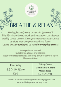 For those curious to explore these benefits in a structured way, a new weekly class in Rye is offering a gentle introduction. “Breathe and Relax,” led by local wellbeing coach Nathalie Desgrange, takes place at the Tilling Green Community Centre every Thursday morning and focuses on simple breathing exercises combined with guided relaxation.
