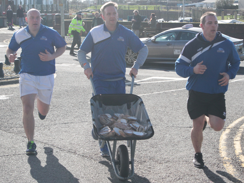 The scallop wheelbarrow race, organised by the Ship Inn on The Strand took place on Sunday March 1 as part of the closing events in this year’s Scallop Festival. The the winning team was from the Harbour Health Club, followed home by teams from the Mermaid Inn and Rye Runners. For more coverage see obsessions and galloping gourmets.